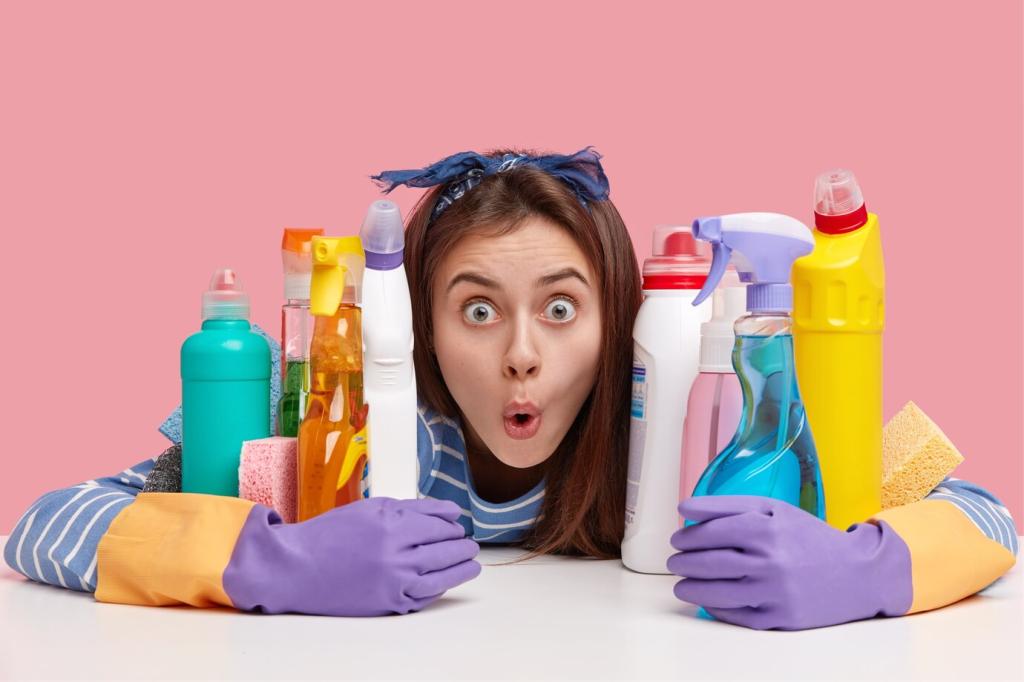 Gezielt sprühen statt durchnässen, Tücher auswringen, punktuell behandeln. Reste kleinflächig entsorgen, nicht in großen Mengen ins Abwasser geben. Teilen Sie Ihre besten Spartipps für eine bewusste Reinigung.